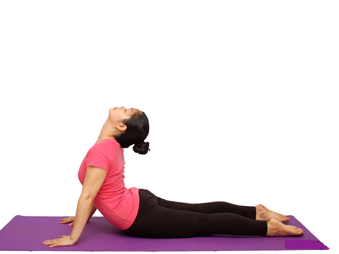 - Now, placing your body’s weight on your palms, inhale and raise your head and trunk. Note that your arms should be bent at your elbows at this stage.