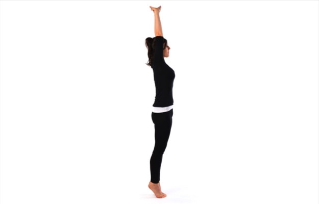 - Now breathe in and stretch your shoulders, arms, and chest upwards. Raise your heels, making sure your body weight is on your toes.